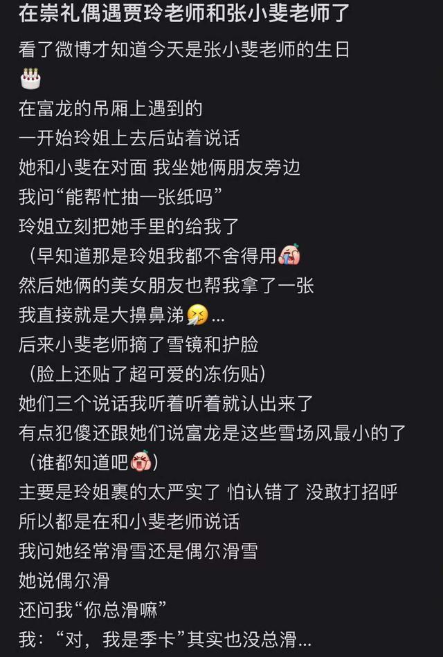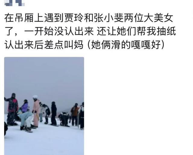 像片里的张小斐穿独处黑,贾玲独处粉,其实,两东说念主裹得如斯严密,不应该被认出才对,巧就巧在爆料的网友因为流鼻涕,向同在一个吊厢里的滑雪爱好者乞助纸巾,穿粉色滑雪服的女子立马把手里那张递给她,张小斐摘了雪镜和护脸后,网友认出她,才后知后觉的知说念了粉色衣服是贾玲。