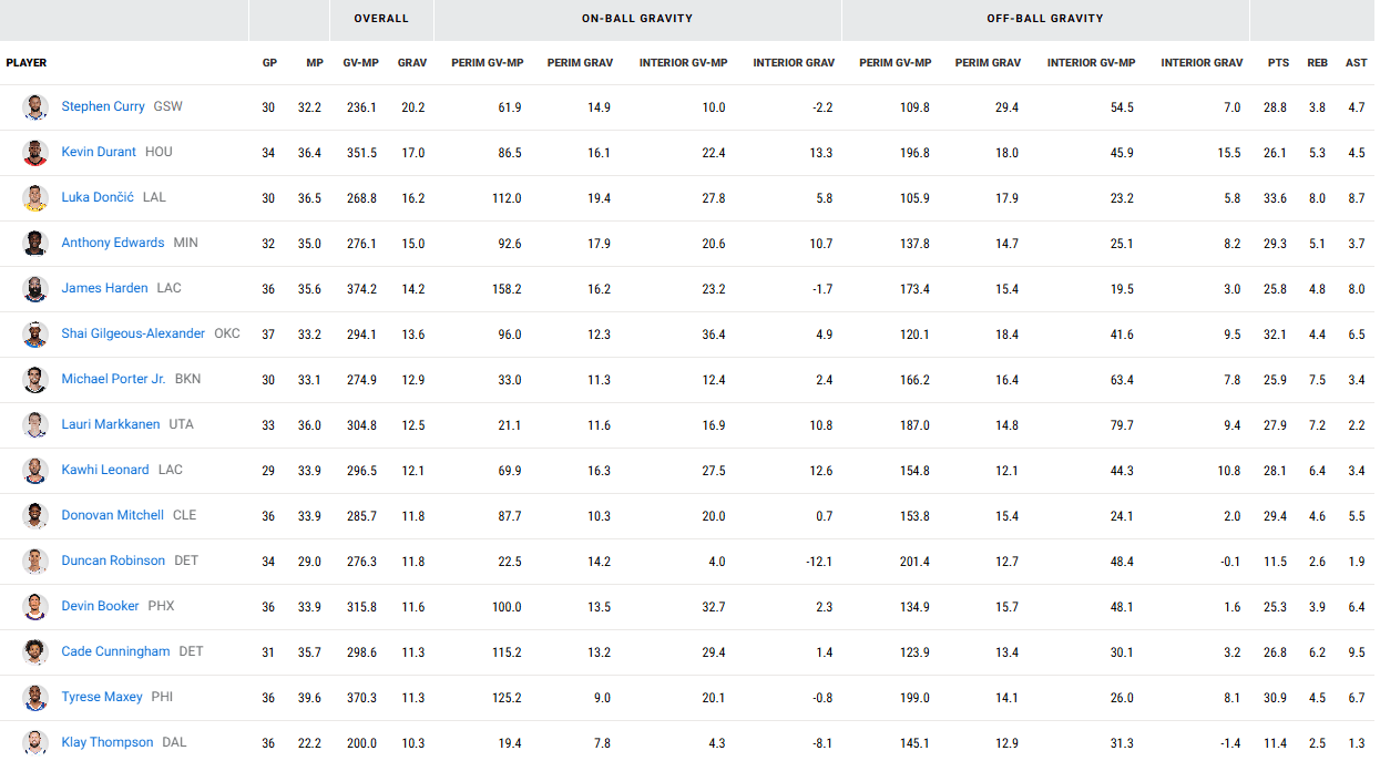 虎扑01月13日讯 此前,NBA官方推出新的数据统计标的——Gravity(引力值)。
